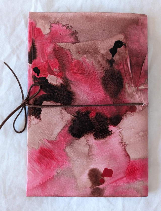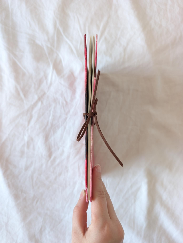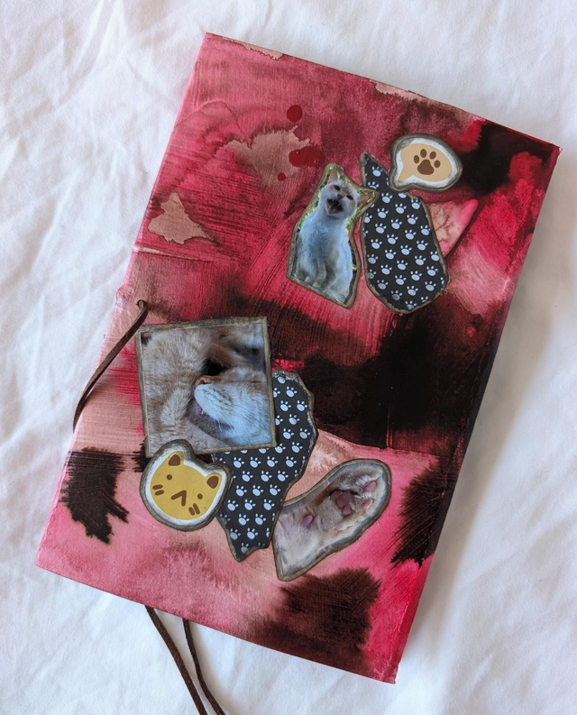 Carnet au format A5, avec des pages blanches et un lacet en cuir pour le fermer. La couverture a entièrement été réalisée à la main sur le thème des chats à partir de photographies personnelles de mon chat O'Malley.