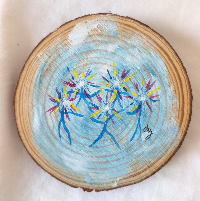 Peinture originale des étoiles filantes du film Ghibli le Château ambulant à l'acrylique sur un rondin. Vendue avec une accroche murale au dos.